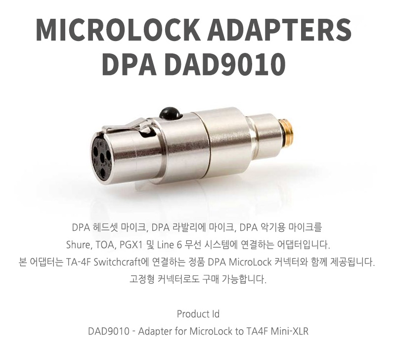 * Shure, TOA, PGX1 & Line 6 wireless systems. * The adapter comes with an original DPA MicroLock to a TA-4F Switchcraft